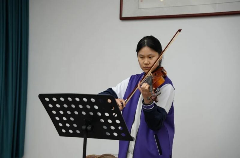 座談間隙,學(xué)生們的精彩表演讓現(xiàn)場溫情再升級:206班盧雨萱的古箏獨(dú)奏《春江花月夜》,弦音裊裊、古韻悠長;207班譚力的獨(dú)唱《心中的日月》,歌聲清澈、滿含敬意;208班劉彩雯的小提琴獨(dú)奏《月半小夜曲》,旋律流轉(zhuǎn)、祝福暗藏。孩子們專注的神情、真摯的情感,贏得老教師們陣陣掌聲。